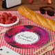 Paper plates with a cool abstract background. Dark red and purple brush strokes create a bold modern vibrant design.