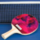Ping pong paddle with a cool abstract background. Dark red and purple brush strokes create a bold modern vibrant design. A rectangle layered over top with a personalised text inside.