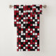Bath towels with a dark red, black, and white random mosaic squares. Customisable. There are three pieces in this bath set. Perfect for any bathroom.