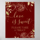 This poster design features faux gold peonies and foliage in a modern, minimal line drawing style on a solid background. "Love is Sweet Please Take a Treat!" features a handwritten cursive typography in matching gold. This sign is the perfect way to let wedding or shower guests know where to pick up their sweet treats.