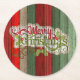 Beautiful, unique, classic, trendy, pretty and decorative Christmas holiday greeting beverage coaster with a classic Holiday dark red, forest green, and white coloured 'Merry Christmas' quote text on a rustic weathered wooden country cottage farmhouse style planks pattern background.