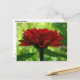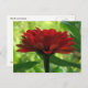 This postcard features a single dark red zinnia flower. The petals are a deep scarlet and are set off by the plant's green leaves and the luminous green and yellow foliage bathed in sunshine.
