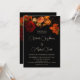 Colorful painted flowers and bride and groom names in an elegant classic calligraphic script on a black background wedding invitation.
