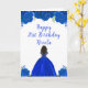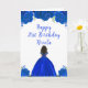 This birthday card features faux glitter royal blue floral flowers and a beautiful princess with dark skin and an elegant dress. This is perfect for a birthday party.