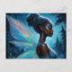 This fantasy postcard features a Black fairy with pointy ears and braids updo hairstyle in a night forest. Shades of blue dominate this fairy profile portrait, including the fairy's blue eyeshadow, blue dress, iridescent blue wings with hints of other colors, and the blue light of night.