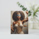 This postcard features an oil painting of a Black woman as Lady Justice, symbolizing truth, fairness, and divine balance. She stands with a blindfold, representing impartiality, while holding a golden scale in one hand and an ornate sword in the other. Her attire is a blend of classical Greco-Roman elegance and fantasy warrior aesthetics, featuring a flowing cream-colored gown adorned with intricate golden armor and gemstone embellishments. Her thick, coiled hair is accessorized with a jeweled headpiece, further enhancing her regal presence.