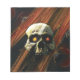 Evil skull with glowing eye sockets and a dark background spattered with streaks of orange, maroon, and black. Happy Halloween, mortals.