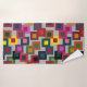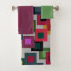 This towel set has a green washcloth, an eggplant coloured hand towel, and a bath towel with a geometric design of squares inside squares in brown, black, brick, yellow, teal, green, purple, gold, pink, red, grey on a field of lighter grey.