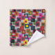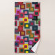 This towel set has a geometric design of squares inside squares in brown, black, brick, yellow, teal, green, purple, gold, pink, red, grey on a field of lighter grey.