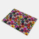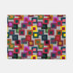 This doormat has a geometric design of squares inside squares in brown, black, brick, yellow, teal, green, purple, gold, pink, red, gray on a field of lighter gray.