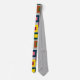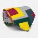 This necktie has a geometric design of squares inside squares in brown, black, brick, yellow, teal, green, purple, yellow, gold, pink, red, grey on a field of lighter grey.