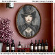 A woman with black hair is dressed in luxurious gothic steampunk attire. Her outfit features a corseted bodice with intricate lace and silver embellishments, long puffed sleeves, and high Victorian collar detailing. She wears an ornate black top hat adorned with metallic plumes, pearls, and a central accent. Her dark curls and pale makeup contrast beautifully with the moody monochrome background framed by an antique oval. This design merges gothic romance with clockwork precision. Artwork similar to a digitally painted vintage portrait with gothic and steampunk influences.