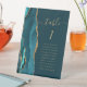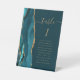 The left-hand edge of this elegant modern wedding table number pedestal features a teal blue watercolor agate border trimmed with faux gold glitter. The word "table" appears in whimsical gold-coloured script on a dark teal background. Add the names of your guests who are assigned to each table.