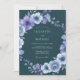 This design features a moody palette of deep teal paired with ethereal cool-toned florals. Delicate periwinkle roses and lavender anemones create a lush border against the dark, dramatic background. Whimsical leaf sprigs add a touch of nature to this elegant winter or evening aesthetic. Perfect for a refined seasonal event.