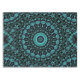 Bring vibrant, calming energy into your home with this eye-catching tablecloth. The design features an intricate mandala pattern with a mesmerizing radial symmetry in shades of turquoise and teal against a dark, nearly black background. The mandala design is made up of delicate floral motifs and flowing lines that radiate outward like petals, creating a sense of depth and motion.