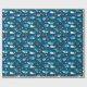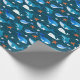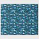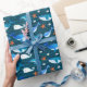 Adorable three types of whale illustrations on a dark teal, tribal hawaiian pattern background. Tiny, orange, starfish within pattern.