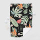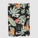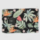 Black background for a floral and foliage fantasy of colourful Bird of Paradise blooms, Anthurium and plumeria blossoms laid over top the Monstera and palm leaves. A very pretty Coastal/ Hawaiian look that is fun and light. Loden greens, red-orange and oranges with a peachy pink accent. All are watercolor painted floral and foliage elements. Personalise with modern Monogram in rectangle frame.