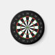 Round throw pillow with a authentic regulation dartboard design in black, red and green.
