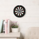 Round wall clock with an authentic regulation dartboard design in black, red ,green and white.