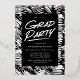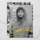 Modern graduation party invitation featuring the graduate's vertical photo with "Grad" in real gold foil handwritten lettering with a dash below. Personalise the trendy photo graduation party invite by adding the graduate's name and school name. The gold foil graduation party invitation reverses to display your party details with a black and white dashed brushstroke background.