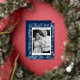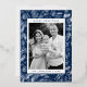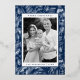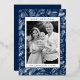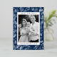 Modern holiday card featuring your photo framed in white with a navy and silver foil dashed geometric pattern. Personalise the foil holiday card with your custom greeting, family name, and year in bold navy lettering. The unique Christmas card reverses to display your custom message in white lettering with a navy background.