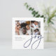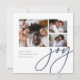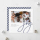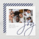 Share cheer with these colourful and modern holiday cards featuring 3 of your favourite photos (one square and two small horizontal or landscape orientated). "Joy" appears in casual, modern hand lettered script in a beautiful jewel toned navy blue shade. Personalise with your custom holiday greeting, family name, and the year along the bottom. An eyecatching choice in a unique rounded square shape for your Christmas 2021 greetings.