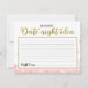 This modern floral "Date Night Idea" card features a pink floral background with golden glitter splashes. The text is written in a mix of a playful calligraphy font and a modern sans font, this Date Night Idea card is personalized with the Bride-to-be name and the Bridal Shower date.