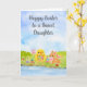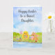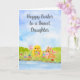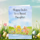 Bright spring colors and playful charm fill this watercolor Easter card, featuring a fluffy baby chick carrying a basket of colorful Easter eggs while a friendly bunny wearing a pink bowtie keeps watch nearby. Set among blooming pastel tulips, the scene captures the excitement and fresh spirit of the season. Thoughtfully created as a special Easter greeting for your daughter, this cheerful design sends warm wishes, smiles, and joyful holiday fun.
