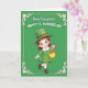 This greeting card features a cheerful young girl in a cute anime-inspired style, standing against a rich green background with a sweet, friendly glow in her rosy cheeks and wide, sparkling eyes 💚. She wears an emerald leprechaun hat with a gold buckle and a matching green dress trimmed in soft white at the collar and cuffs, giving her a cozy, dressed-up look. Light brown boots and white socks ground the outfit with everyday detail, like she’s ready to skip over for a hug or a laugh with someone close. Instead of a pot of gold, she lifts a shiny golden cauldron overflowing with fuchsia blossoms, adding a surprising pop of color that feels like a thoughtful gift ☘️. The scene is framed by a delicate white border of curling vines and small flowers, gently wrapping around her like a decorative embrace. At the top, “Dear Daughter” sits above “HAPPY ST. PATRICK’S DAY,” both in white lettering that stands out clearly against the green. The white floral-and-vine frame continues evenly around the edges, with the bright blossoms clustered high in the raised cauldron.