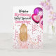 A beautiful illustration of a woman with long blonde hair holding a bunch of vibrant pink, purple and fuchsia coloured balloons is surrounded by soft pink confetti ribbons and glitter. The words, happy birthday to a very special daughter (which may be changed to granddaughter, niece, godchild etc) appears on a white background. The inside has a lovely tender message which should be customised to suit whatever family relation you have inserted on the front.
