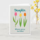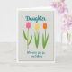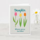 This card features the large word “Daughter” centered near the top in a deep teal, written with smooth, flowing lettering that feels like a gentle hug. Just beneath it, three stylized tulips sit in a neat row, their petals colored soft pink, sunny yellow, and warm orange, like a small bouquet offered with quiet affection 🌷. Each flower has a slender green stem and angled leaves that lean slightly, as if the blooms are turning toward one another in friendly closeness. The background is a light gray with a subtle texture, giving the design a soft, tactile look without strong contrast. Near the lower portion, the phrase “Wherever you go, love follows” appears in matching teal, set smaller and spaced to read easily. The layout keeps generous open space around the lettering and flowers, letting the teal text and bright petals stand out clearly. The three tulips stretch horizontally across the middle, with their green leaves fanning outward under the pink, yellow, and orange blossoms 🐇.