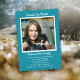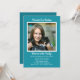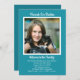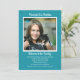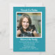 Framed photo adoption announcement for a girl of any age, but perfect for an older child. Pretty teal blue with white text. Include a photo with party information to celebrate the new family member. Bold script at top is for her name with "Welcome to the family" beneath the photo. All party text is added in paragraph form using a modern, printed font. Reverse is solid blue. Upload a photo of either orientation to fit the square frame.
