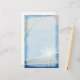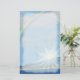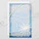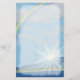 The birth of a new day: the early morning sun creates a rainbow in the sky. New life. New start. New job. The "Dawn of a New Promise" stationery can be used to celebrate parenthood, new career, graduation, or even a cancer survivor's life. The picture shows a rainbow arching near the top of the page, and sun rays breaking above the mountain range's view with water below.