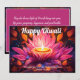 This exquisite Diwali card radiates warmth and celebration. At its centre blooms a majestic lotus in hues of fuchsia, saffron, and violet—cradling a softly glowing candle that symbolises spiritual light and festive joy. The background is an abstract swirl of deep sunset tones and electric purples, lending a dreamy, magical energy to the design.