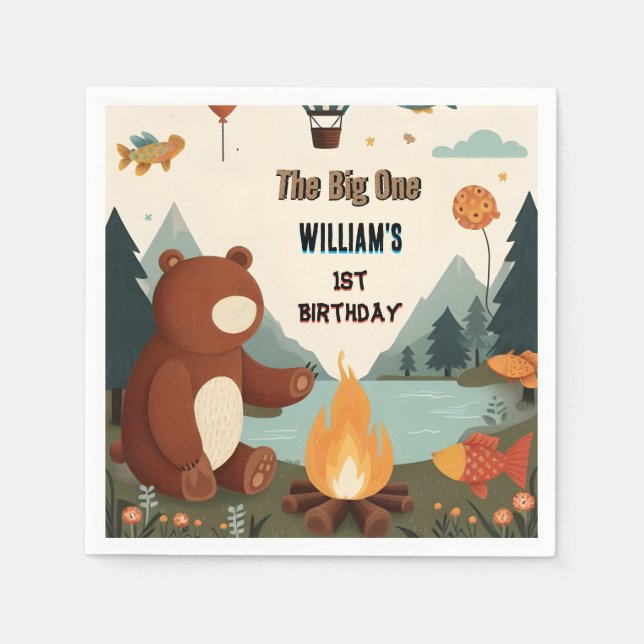 Day Brown Fun Fish Boy Cute Baby Bear 1st Birthday Napkin