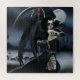 Woman with a day of the dead sugar skull painted on her face. A raven walks with her on her shoulder through the cemetery. Many symbols of death and rebirth all around her.