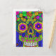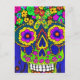 Bright flowers on a dark background of a skull. Remembering our ancestors with love and fondness is part of living. The skill in flowers is part of this, the flower's new growth. The skull's end of life. The colours used are green pink yellow and red.