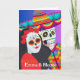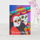 Day of the Dead Greetings for a daughter and son in law, son-in-law, Dia de los Muertos, paper greeting card with a skeleton couple in bright colourful clothing and painted faces. Art, image, and verse copyright © Shoaff Ballanger Studios, 2023.