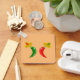 This fun double sided keychain features a pair of chilis, a red chilli and a green chilli. They both have black eyes and pink mouths. Each Chilli is wearing a sombrero hat that has a skull of the opposite colour to the chilli on it in celebration of the Mexican Day of the Dead festival, Dia De Los Muertos. The sombrero also contains three flowers with alternating red and green petals representing the flag of Mexico. There is custom text on the back so you can personalise this design however you like.