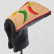 This awesome golf putter cover features a pair of chilis, a red chilli and a green chilli. They both have black eyes and pink mouths. Each Chilli is wearing a sombrero hat that has a skull of the opposite colour to the chilli on it in celebration of the Mexican Day of the Dead festival, Dia De Los Muertos. The sombrero also contains three flowers with alternating red and green petals representing the flag of Mexico.
