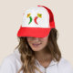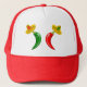 This awesome hat features a pair of chilis, a red chilli and a green chilli. They both have black eyes and pink mouths. Each Chilli is wearing a sombrero hat that has a skull of the opposite colour to the chilli on it in celebration of the Mexican Day of the Dead festival, Dia De Los Muertos. The sombrero also contains three flowers with alternating red and green petals representing the flag of Mexico.