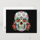 Postcard with an image of a Day of the Dead skull decorated with pink flowers and vines, red roses and a cross with four drops of blood on black. The back is white with an optional description. The Day of the Dead, or All Souls' Day, is celebrated on November 2 in various European and Latin American countries. In Mexico the period of All Souls' Day festivities is held for several days, including All Saints' Day on November 1. See matching label and sticker. See the entire Mexico Postcard collection in the CARDS, POSTCARDS & STICKERS section.