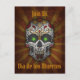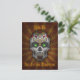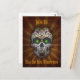 Celebrate The Day of the Dead, Halloween, or other autumn events with this unique postcard which can be used as an invitation. The front features an illustration of a traditional sugar skull with glowing lime green eyes, it's decoration coloured in shades or rust, orange, charcoal, grey, tan and lime green. The skull is set against a spooky grunge sun ray background in rust and golden yellow. Text (which can be changed and personalised) rads 'Join Us' and 'Dia de los Muertos'. The reverse side has templates where you can place your custom text with event details. The centre divider art of a sugar skull and leaf branches can be moved to any location or deleted if desired.