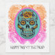 A bold in your face edgy Halloween party wine labels with painted sugar skull in orange, turquoise and hot pink, on a chalkboard background with a quirky font. nThe back of the card is hot pink. Sure to catch their attention!