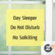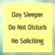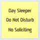 For night workers who sleep during the day to minimise the distubances of daily life so you can get some sleep this yellow and black design in a cool stencil lettering will alert solicitors and delivery people not to knock or ring your bell with the message: Day Sleeper, Do Not Disturb, No Solicitiing.
