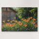 Bright, peachy-orange daylilies grow in front of an old, wooden shed on this beautiful jigsaw puzzle. Bright and colourful, and perfect for anyone who loves nature, flowers, and gardening.