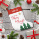 “May your days be merry & bright.” A playful illustration of a red script typography quote and green trees against a gold glitter star background, with a personalised name in the red band, helps you usher in Christmas and New Year. Feel the warmth and joy of the holiday season whenever you hang up this stylish and modern personalised name stocking. Your choice of small or large size. Matching and coordinating cards, envelopes, stickers, giftwrap, pillows and other products are also available. Give this to someone special!