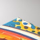 Otis Porritt's digital artwork presents a striking close-up of a woman's face, framed within the reflective visor of an astronaut's helmet. Her intense blue eyes, adorned with long lashes, and delicate freckles draw the viewer in, contrasted by vibrant red lips. The piece is rendered with bold, expressive strokes that mimic a rich impasto texture, creating a dynamic visual surface. A vivid palette of deep blues, bright yellows, and fiery reds dominates, with a playful polka-dot pattern animating the background, enhancing the work's energetic and captivating presence.