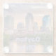 This is a digital photo of the Dayton Ohio skyline at sunset. The sky is orange and lavender. The skyline has modern and vintage buildings. The coaster is a square glass coaster. The glass coaster is dishwasher safe.