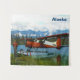 A bush pilot stands near his de Havilland Canada DHC-2 Beaver floatplane on the shore of a lake in the far north; mountains and trees are in the distance. Customisable text reading "Alaska" also appears. This image was derived, in part, from a US Fish and Wildlife Service photo.